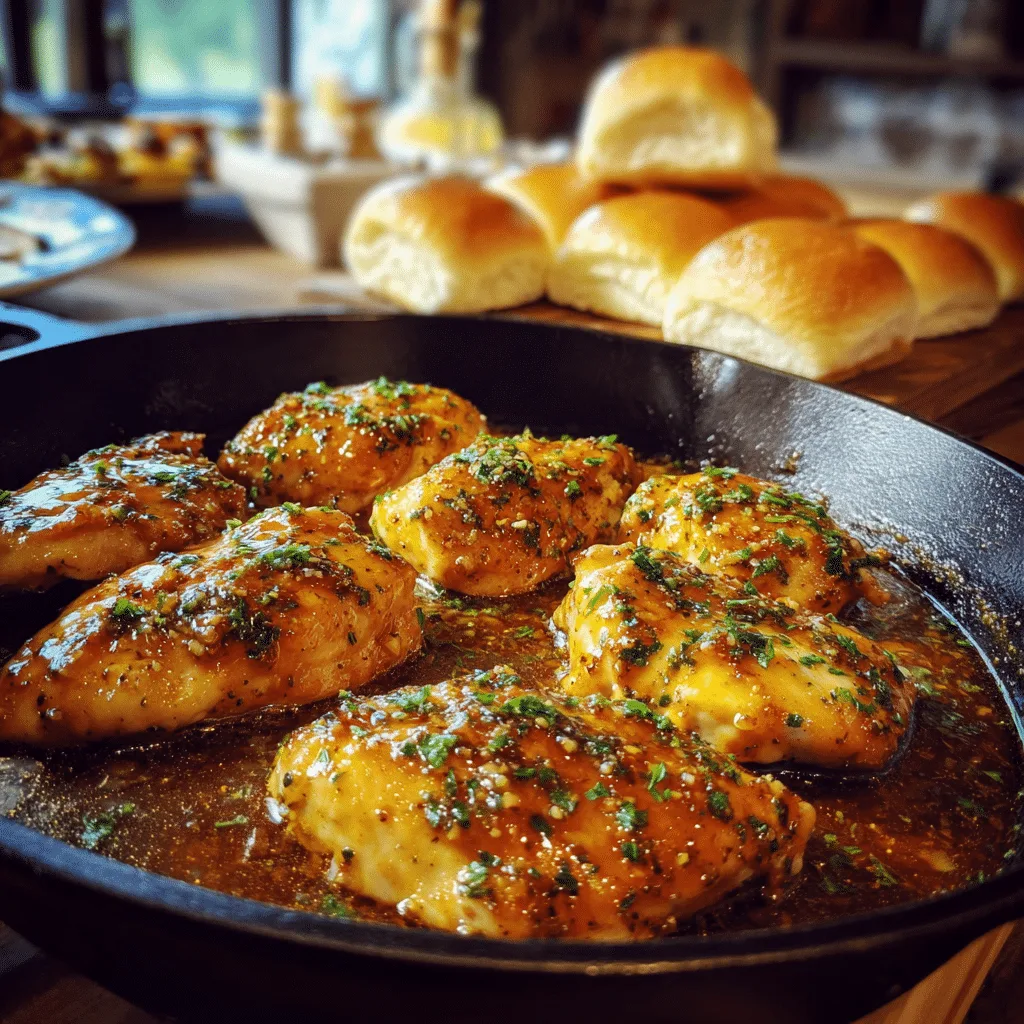Recipe Summary: This Texas Roadhouse Butter Chicken Skillet brings tender chicken breasts seared to golden perfection and simmered in a luscious buttery garlic sauce. Combining melted butter, minced garlic, heavy cream, and grated Parmesan cheese, it recreates the signature flavor you love at home. Ready in under 30 minutes, this fast and easy chicken dinner recipe makes a hearty meal or a thoughtful easy dinner to take to someone. Simply sear the seasoned chicken, add garlic butter sauce, let it thicken, and garnish with fresh parsley. Serve over rice or crusty bread for a satisfying family favorite.