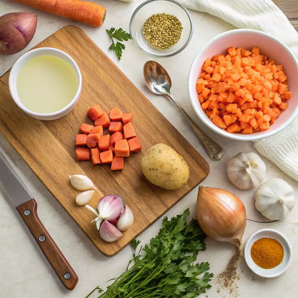 In my version of vegan carrot potato soup, everything happens in one pot. No roasting. No blending unless you want to. Just sauté, simmer, and season. You’ll sauté the onions first, then add garlic, carrots, and diced russet potatoes. From there, pour in your vegetable broth, and let the soup simmer until everything is soft enough to mash. If you want it extra creamy, hit it with an immersion blender—but it’s totally optional.